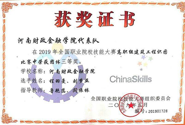 |   2019年5月10-12日,由教育部主办,天津市教委承办,天津城市建设管理职业技术学院、全国住房和城乡建设职业教育教学指导委员会协办的“建筑工程识图”在天津举行。此次大赛共有来自全国各省市、自治区的105支代表队共计210名选手参加比赛。我校代表队由鲁艳蕊、闫振林老师指导的2016级建筑设计专业刘梦亚、程羽曼同学组成,取得团体三等奖。      本次竞赛内容分为建筑工程施工图识图和建筑工程施工图绘图两部分,选手需要根据给定的建筑工程施工图、图纸会审纪要、设计变更单等资料合作绘制建筑专业、结构专业施工图。此次大赛深化职业教育教学改革,积极践行校企合作、工学结合的应用型人才培养模式,进一步推进专业建设和教学改革,展现了我校参赛师生的精神风貌和技能水平。